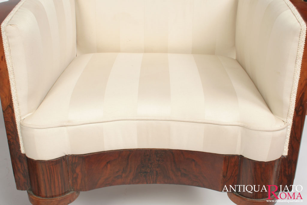 Anche in questo caso si fa riferimento alla tradizione, per cui le imbottiture dopo essere state smontate vengono rifatte su basi di molle e materiali naturali con successiva preparazione in bianco, sulla quale si interviene con la tappezzeria in tessuti scelti secondo il tipo di mobile.