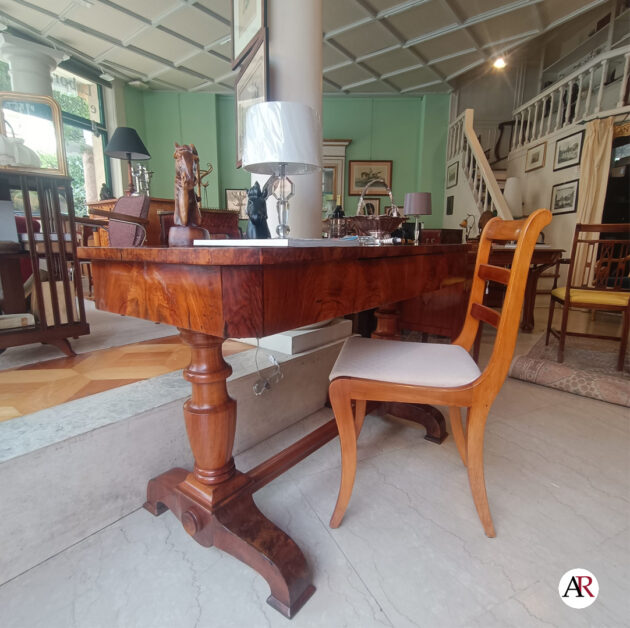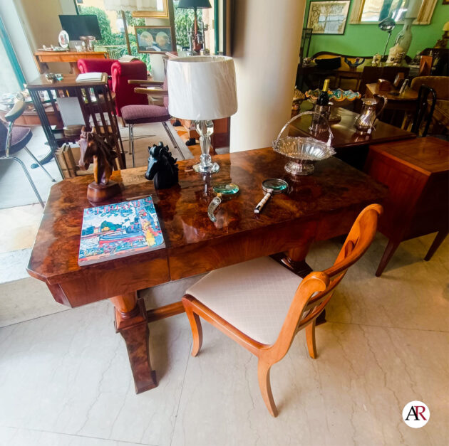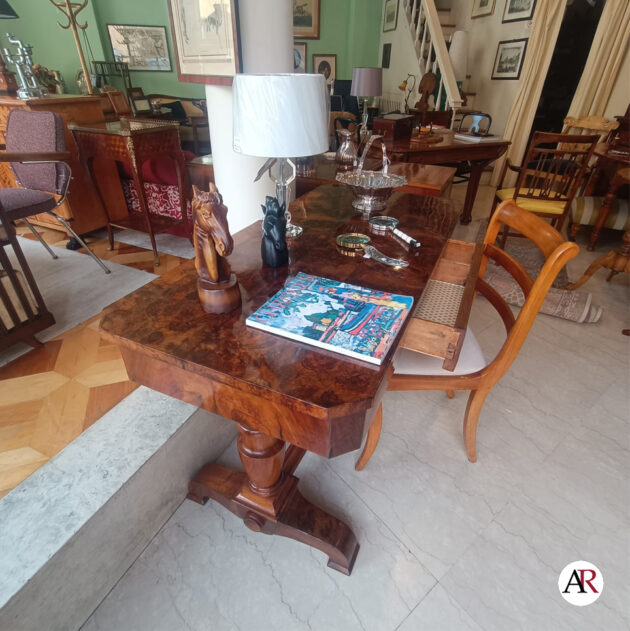 in noce e radica di noce di epoca Biedermeier, un cassetto centrale a scomparsa